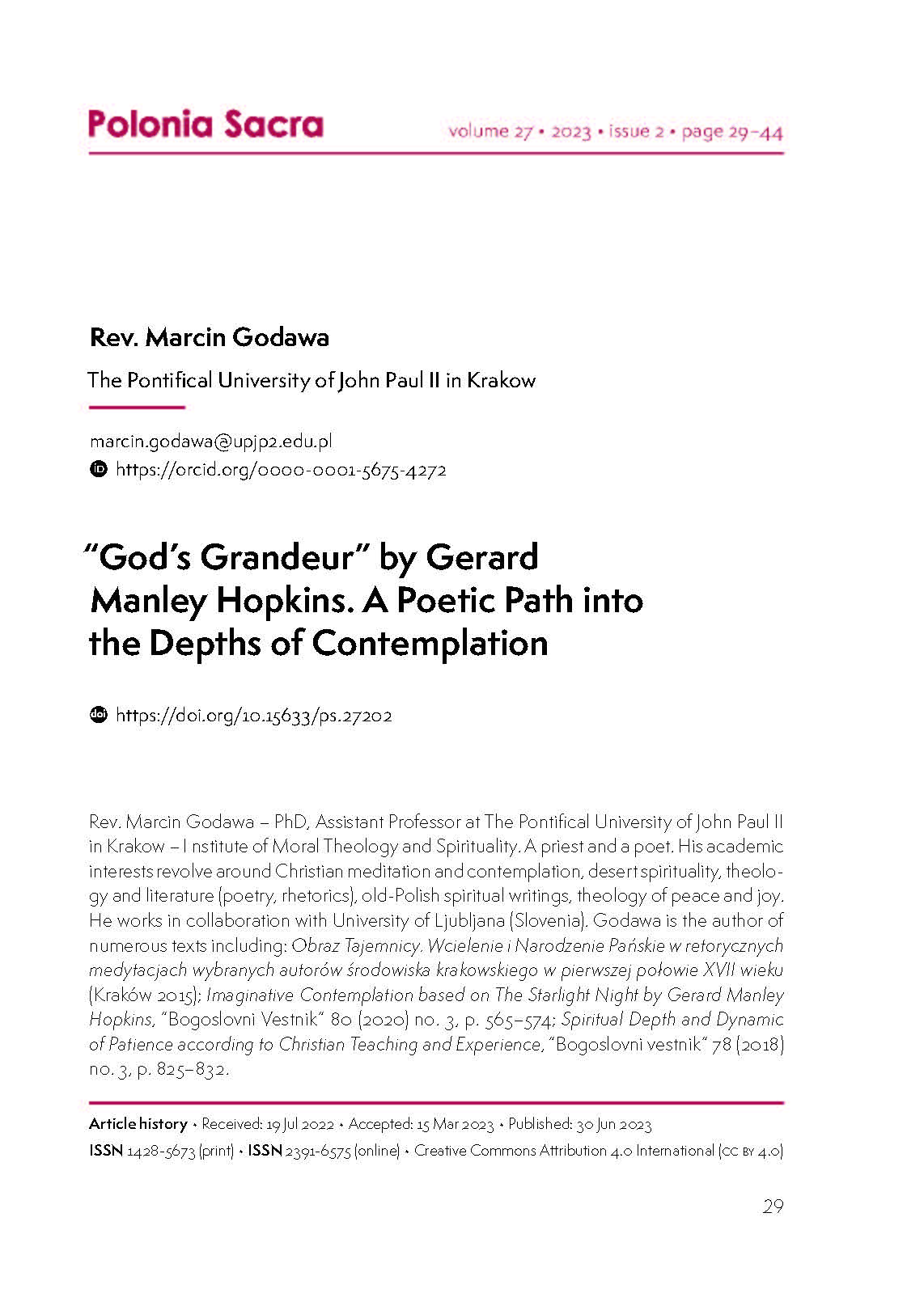 - Pozycja“God’s Grandeur” by Gerard Manley Hopkins. A Poetic Path into the Depths of Contemplation(Uniwersytet Papieski Jana Pawła II w Krakowie, 2023-06-30) Godawa, MarcinThe present paper concerns the question of how Christian contemplation, in the sense of a simple loving gaze on God and His works, could be prepared and supported by poetry by using the properties of poetic speech in the field of semantics, syntax as well as sound effects. The object is God’s Grandeur, a brilliant sonnet by Gerard Manley Hopkins, a poet, priest, Jesuit, a man of spiritual passion. Its analysis along with interpretation, in terms of both poetics and spiritual theology, will allow us to see how aesthetic contemplation works and could bear fruit for a contemporary man’s relation to himself or herself, to the world as well as most importantly to God, the source of created goodness.